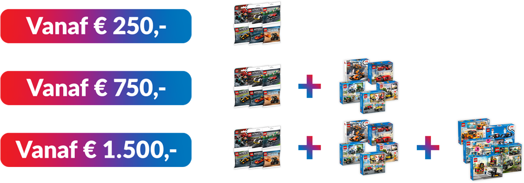 Je krijgt de eerste gratis LEGO al vanaf € 250,00 en het mooie is dat we de LEGO gewoon doorstapelen naarmate je meer bestelt. Bekijk onderstaande voorwaarden om te zien vanaf welke bedragen we LEGO doorstapelen!